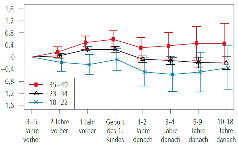 Bei besonders jungen Eltern in Deutschland steigt die Zufriedenheit zum Zeitpunkt der Geburt kurz an und fällt danach stark ab. [weniger]