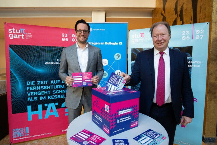 First Mayor Fabian Mayer and Wolfram Ressel, Rector of the University of Stuttgart, presented the question box in the Stuttgart Town Hall for the purposes of the ’Wissenschaftsjahr 2022’. Photo: Leif Piechowski/Stadt Stuttgart