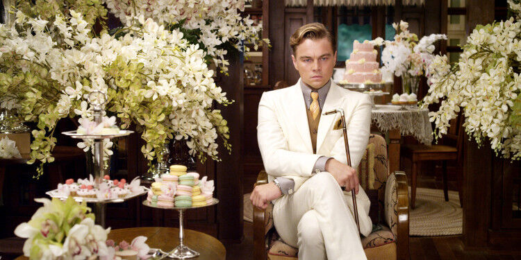 The image shows a man dressed in a white suit sitting alone on a chair, staring absently into space. He is surrounded by flowers and pastries on several small tables. © picture alliance / Everett Collection | © Warner Bros/Courtesy Everett Collection