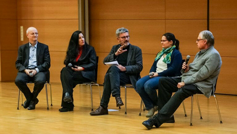 Kick-off Themenjahr im Audimax: Jens Haueisen, Doris Heinrich, Claudia Lenk und Hartmut Witte sprachen mit Moderator Marco Frezzella ( Mitte ) über ihre Forschungsprojekte. Technologien als Wegbereiter für unser Wohbefinden - in zahlreichen interdisziplinären Forschungsprojekten entwickeln Wissenschaftlerinnen und Wissenschaftler der TU Ilmenau innovative technologische Lösungen, die unsere Lebensqualität steigern. Beim Kick-off des neuen Themenjahrs Umwelt und Gesundheit sprachen Forschende über ihre wegweisende Arbeit. Möglichst lange gesund zu leben - das streben viele Menschen an. Neue technologische Lösungen in der Medizintechnik, Sensorik oder Messtechnik erhöhen nicht nur unsere Lebensqualität, sondern auch die Heilungschancen zahlreicher Krankheiten. Wissenschaftlerinnen und Wissenschaftler weltweit erforschen vielversprechende Technologien und Methoden, die unsere Gesundheit und Umwelt erhalten - so auch an der Technischen Universität Ilmenau. In interdisziplinärer Zusammenarbeit leisten sie Spitzenforschung, die es möglich macht, unsere heimischen Wälder zu bewahren, hörbeeinträchtigten Personen ihre Hörfähigkeit wiederzugeben, sich dank maßgeschneiderter Prothesen besser bewegen zu können oder OP-Patientinnen und -Patienten schonend zu beatmen.