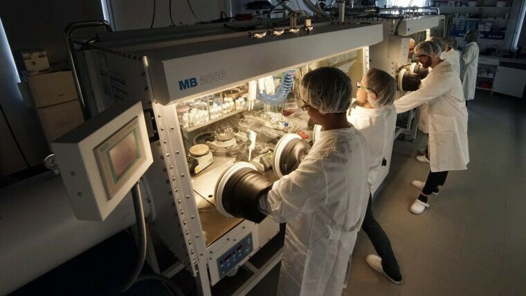 Studierende und Lehrende in einem Labor für organische Solarzellen, Batterien und Solarbatterien. Foto: Jan-Peter Kasper (Universität Jena)