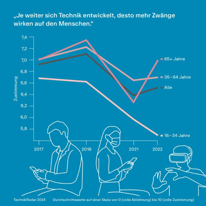 Auch bei anderen Fragestellungen haben sich die Ansichten von jüngeren und älteren Deutschen voneinander entfernt. Die Generation 65plus teilt laut der jüngsten Befragung eher die Befürchtung, dass Technik ihre Freiheit einschränken könnte. Bei der Aussage ,,Je weiter sich die Technik entwickelt, desto mehr Zwänge wirken auf den Menschen" erreicht die Zustimmung der älteren Altersgruppe auf einer Skala von 0 (volle Ablehnung) bis 10 (volle Zustimmung) einen Wert von 7,0. Die 16 bis 34-Jährigen weisen mit 5,7 im Vergleich mit allen anderen untersuchten Gruppen den niedrigsten Wert auf.
