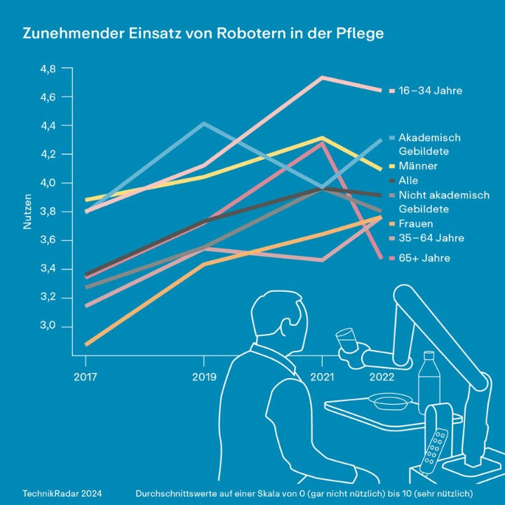 Die Erhebungen des TechnikRadar zeigen, dass die Deutschen Technik sehr differenziert und stark anwendungsbezogen bewerten. Der Einsatz von Robotern in der Pflege wird beispielsweise auf einer Skala von 0 (gar nicht nützlich) bis 10 (sehr nützlich) mit einem Wert von 3,9 im Jahr 2022 eher kritisch gesehen, auch wenn die Nutzenbewertung seit 2017 stetig gestiegen ist (vgl. 2017: 3,4). Ein stärkerer Einsatz von Robotern im Bausektor wird hingegen mit einem Wert von 5,1 als deutlich nützlicher eingeschätzt.