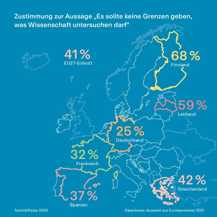 Die Aussage ,,Dem technischen Fortschritt dürfen keine Grenzen gesetzt werden" trifft bei 30,1 Prozent der Befragten auf Zustimmung, während sie von 36 Prozent abgelehnt wird. Ein Drittel (33,9 Prozent) ist unentschlossen. Eine ähnliche Verteilung konnte auch bereits bei früheren Erhebungen beobachtet werden.Im europäischen Vergleich - das zeigt eine Analyse der Eurobarometer-Umfragen, die für das TechnikRadar 2024 durchgeführt wurde - wünschen sich die Deutschen jedoch vergleichsweise mehr Kontrolle über den technischen Fortschritt als ihre Nachbarn. Bei der jüngsten Eurobarometer-Erhebung aus dem Jahr 2021 stimmten unter den deutschen Befragten rund 25 Prozent der Aussage ,,Es sollte keine Grenze geben, was Wissenschaft untersuchen darf" zu. Der durchschnittliche Zustimmungswert über alle europäischen Länder hinweg lag dagegen bei rund 41 Prozent.