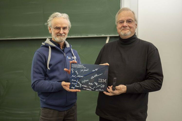 Symbolische z14-Übergabe: Christian Schubert, Rechenzentrumsleiter Mainframe bei Beta Systems, und Martin Bogdan vom Institut für Informatik der Universität Leipzig. Foto: Andreas Friedrichs, Beta Systems - Das Institut für Informatik der Universität Leipzig hat einen neuen Großcomputer: Die Beta Systems Software AG, ein führender Anbieter von IT-Lösungen und -Dienstleistungen, hat der Universität einen ,,z14 Mainframe" gespendet. Die Übergabe fand heute (5. Dezember 2023) statt. ,,Durch die Spende sind wir nun auch in der Lage, Künstliche Intelligenz auf dem Mainframe direkt in die Übungen der Lehrveranstaltungen einzubauen", freut sich Informatik-Professor Martin Bogdan. Der ,,z14 Mainframe" ist ein hochleistungsfähiger Rechner, der wertvolle Dienste in Forschung und Lehre leisten kann. Er ist in der Lage, komplexe Berechnungen und Simulationen durchzuführen und große Datenmengen sicher zu verarbeiten. Damit ist er ein ideales Werkzeug für die Ausbildung von jungen Fachkräften im Bereich Informatik und Mathematik.