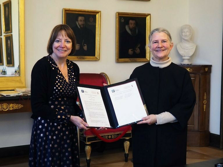 Prof. Shearer West (links), Rektorin und Präsidentin der Universität Nottingham, und Karla Pollmann, Rektorin der Universität Tübingen, mit der unterzeichneten Partnerschaftsvereinbarung.