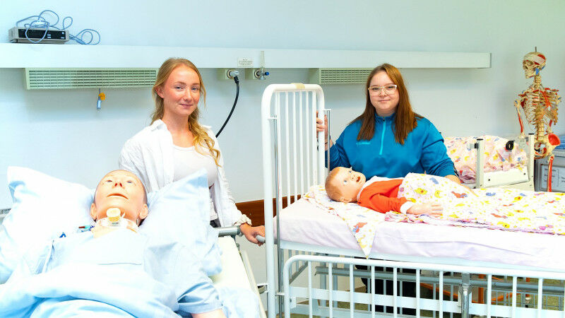 Schon bald werden sie echte Patientinnen und Patienten betreuen: Bei Marleen Schneider ( links ) werden es Erwachsene sein und bei Rieke Busch-Quintero Dominguez Kinder und Jugendliche. Copyright: Karin Kaiser/MHH - Marleen Schneider und Rieke Busch-Quintero Dominguez absolvieren bei uns die Ausbildung zur Pflegefachfrau. ,,In unserer Klasse sind ganz unterschiedliche Auszubildende, manche kommen direkt von der Schule, andere aus dem Berufsleben oder aus dem Studium", erklärt Rieke Busch-Quintero Dominguez. Doch trotz der Unterschiede haben die jungen Frauen und Männer viel gemeinsam. ,,Alle sind wissbegierig, haben großes Interesse und wollen möglichst viel aus der Ausbildung mitnehmen", sagt die 19-jährige Hannoveranerin. Diese Beschreibung passt auch auf sie selbst und ihre Mitschülerin Marleen Schneider. Denn die jungen Frauen haben ebenfalls einen unterschiedlichen ,,Hintergrund" und gehen voller Elan in die Ausbildung zur Pflegefachfrau.