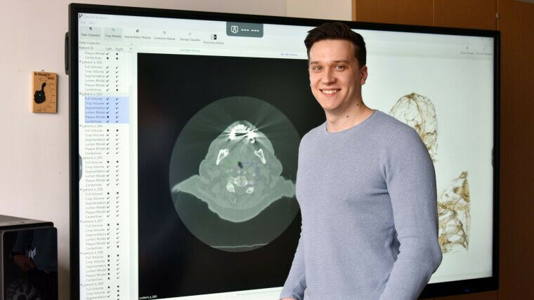Pepe Eulzer hat im Rahmen dieses Projekts ein Softwareframework entwickelt, das die Analyse von Karotisstenosen unterstützt. Die Behandlung solcher Verengungen ist nicht ganz einfach, da das Schlaganfallrisiko gegen das Komplikationsrisiko einer Operation abgewogen werden muss. Daher ist es von besonderer Bedeutung, die Gefährlichkeit einer Stenose richtig einzuschätzen. ,,Unser Ziel war es vor allem, Lücken zwischen modernen, computergestützten Analysemethoden und der klinischen Praxis zu schließen", sagt Eulzer. ,,Dafür haben wir eng mit klinischen Partnern zusammengearbeitet und unter Berücksich­tigung der realen Einschränkungen im Gesundheitswesen versucht, die diagnostischen Möglichkeiten zu erweitern." In einer integrierten Verarbeitungs-Pipeline wurden die komplexe Bildverarbeitung sowie die Blutflusssimulation in praktische klinische Werkzeuge integriert und so anwendbar gemacht. ,,So enthält das Framework beispielsweise Werkzeuge für eine automa­ti­sche, objektive Stenoseklassifizierung und für die Blutströmungsanalyse", erläutert der Informatiker von der Universität Jena.