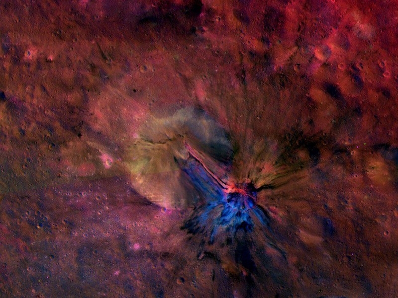 Neue Auswertungen zeigen, wo der Protoplanet am interessantesten ist. Manche Schönheit offenbart sich erst auf den zweiten Blick. Ein solcher Fall ist auch der Protoplanet Vesta, den die NASA-Raumsonde Dawn von Juli 2011 bis August 2012 umkreiste. Wissenschaftler des Max-Planck-Instituts für Sonnensystemforschung haben nun die Daten des bordeigenen Kamerasystems neu ausgewertet. In ihren Bildern zeigen sich nicht nur geologische Strukturen, die für das bloße Auge unsichtbar sind, in bisher unerreichter Detailschärfe. Auch Landschaften von unvergleichlicher Schönheit treten klar hervor. Krater Aelia, 40°O/14°S: Mit dem freien Auge wären die Fließstrukturen im und am Aelia-Krater, die sich hier in Blau und Rot vom Untergrund abheben, nicht sichtbar.