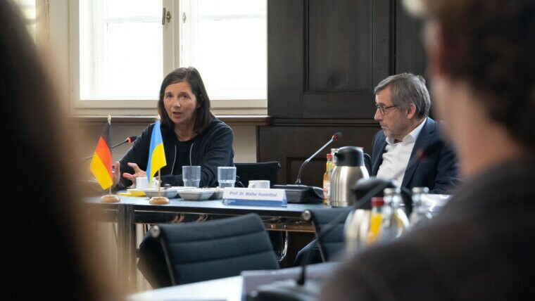 Katrin Göring-Eckardt (l.) sprach mit Uni-Präsident Walter Rosenthal und ukrainischen Studierenden. Foto: Jens Meyer (Universität Jena) - Katrin Göring-Eckardt, Vizepräsidentin des Deutschen Bundestags, hat sich bei ihrem Besuch am 2. September an der Friedrich-Schiller-Universität Jena für das große ,,Hilfs-Paket" bedankt, das die Universität für ukrainische Studieninteressierte, Studierende, Promovierende sowie Wissenschaftlerinnen und Wissenschaftler geschnürt hat. Es reicht von einem Gasthörerprogramm für Geflüchtete über mehrmonatige Forschungsaufenthalte für Wissenschaftlerinnen und Wissenschaftler aus der Ukraine in Jena bis hin zu Online-Angeboten, die Studierenden in der Ukraine helfen, ihr Studium fortzusetzen. Und dass diese Maßnahmen hochwillkommen und wichtig sind, machten die am Gespräch mit Göring-Eckardt teilnehmenden ukrainischen Studierenden und Promovierenden dankbar deutlich. Wir bauen auf den bestehenden Partnerschaften mit ukrainischen Hochschulen auf und haben neue Kontakte geknüpft, um es Studierenden sowie Wissenschaftlerinnen und Wissenschaftlern so gut es geht zu ermöglichen, in der Ukraine weiter studieren und forschen zu können ", sagte Uni-Präsident Walter Rosenthal. Für diejenigen, die aus der Ukraine flüchten mussten, haben wir Angebote in Studium und Forschung geschaffen, damit sie hier in Jena Zuflucht finden und gleichzeitig etwas für ihre Zukunft tun können.