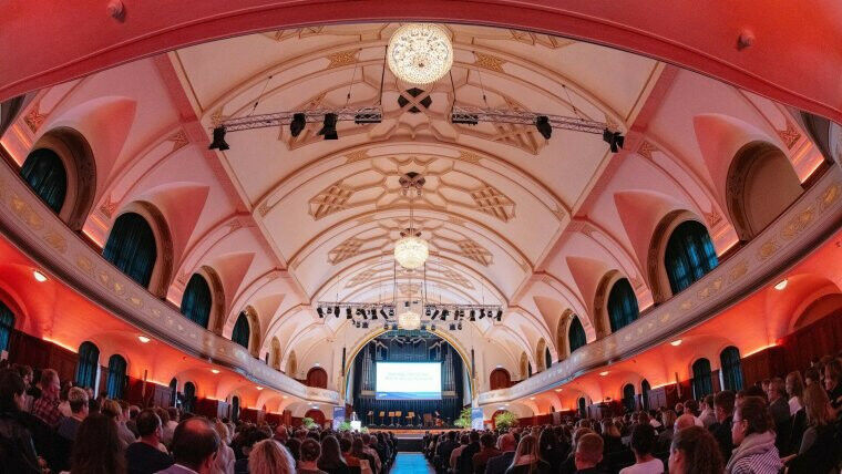 Im vollbesetzten Volkshaus wurden die Erstemester der Matrikel 2023/24 begrüßt. Foto: Jens Meyer (Universität Jena)