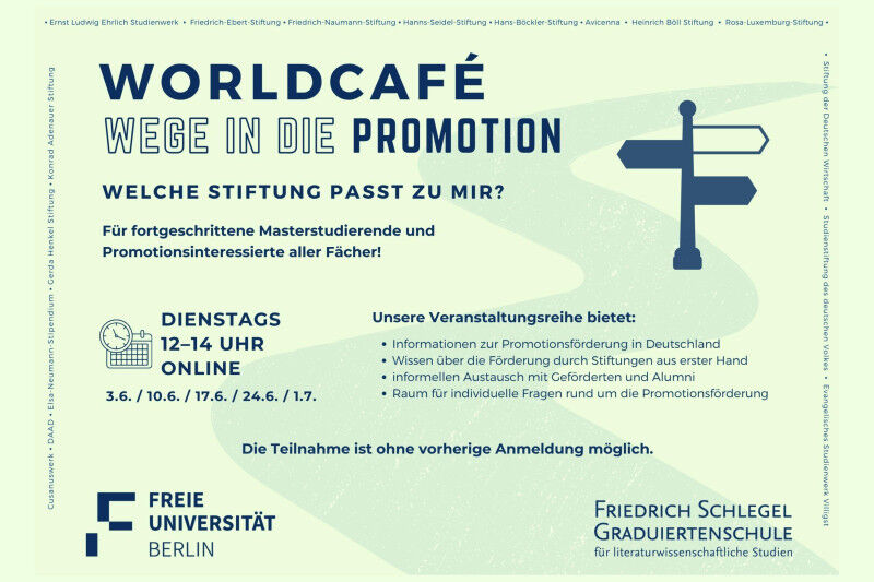 Das ,,WorldCafé: Wege in die Promotion - Welche Stiftung passt zu mir?" beginnt ab 3. Juni mit einer Informationsveranstaltung zu den verschiedenen Möglichkeiten der Promotionsfinanzierung. In vier weiteren Terminen bis 1. Juli stellen Vertreter*innen politischer, konfessioneller und öffentlicher Stiftungen ihre Promotionsförderprogramme vor und beantworten Fragen rund um den Bewerbungsprozess und die Fördermodalitäten.