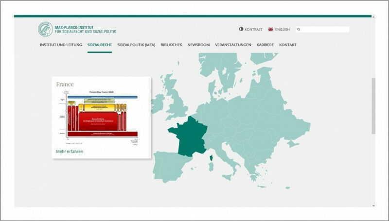 Auf der Webeseite des Max-Planck-Instituts für Sozialrecht und Sozialpolitik bietet das  Projekt Pension Maps einen Überblick über Rentensysteme verschiedener Länder. Fährt man mit der Maus über die Karte, gibt es eine Vorschau für die bislang ausgewerteten Länder. Genauere Informationen erhält man per Mausclick. MPI für Sozialrecht und Sozialpolitik - Die Pension Maps des Max-Planck-Institut für Sozialrecht und Sozialpolitik erleichtern Vergleiche zwischen der Altersvorsorge in verschiedenen Ländern Welches Land hat das beste Rentensystem? Darauf gibt es zwar keine einfache Antwort, aber mithilfe der Pension Maps des Max-Planck-Instituts für Sozialrecht und Sozialpolitik nun erstmals eine leicht verständliche Übersicht über die Alterssicherung in zehn Ländern: Deutschland, Österreich, Frankreich, Italien, Großbritannien, Griechenland, Norwegen, die Tschechische Republik, Slowenien und Bulgarien. Anhand einfacher Grafiken lässt sich auf einen Blick ablesen, wie die Alterssicherung in einem Land organisiert ist, welche Sicherungsfunktion die verschiedenen Teile des Systems haben, wer Zugang zu einer Zusatzversorgung hat und wie hoch das durchschnittliche Rentenniveau in einem Land im Vergleich zum Durchschnitt in Europa und der OECD ist. ,,Die Idee der Pension Maps ist, die aufgrund ihrer historischen Wurzen teilweise sehr unterschiedlichen Alterssicherungssysteme auf eine für jeden verständliche Weise sichtbar zu machen und miteinander vergleichen zu können", sagt Ulrich Becker, Direktor am Max-Planck-Institut für Sozialrecht.