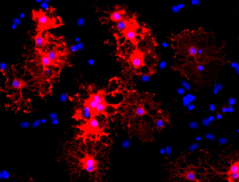 Reife Oligodendrozyten (rot) in Kultur. Sie differenzierten sich aus induzierten Oligodendrozyten-Vorläuferzellen (iOPC), die wiederum aus Perizyten entstanden sind (blau: Zellkerne).