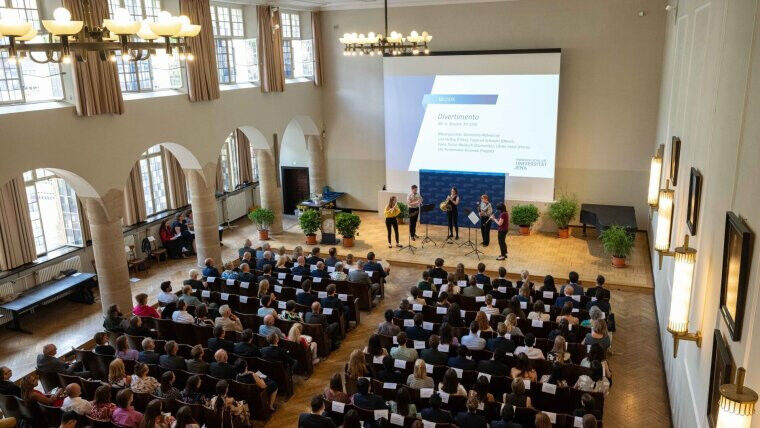 Heute (27. Juni) ist »Schillertag«. Mit diesem jährlichen Festtag erinnert die Friedrich-Schiller-Universität Jena an die Antrittsvorlesung ihres Namenspatrons und ehemaligen Professors im Jahr 1789. Traditionsgemäß werden am »Schillertag« die besten Nachwuchswissenschaftlerinnen und -wissenschaftler der vergangenen zwölf Monate ausgezeichnet. Uni-Präsident Andreas Marx begrüßte die anwesenden Doktorinnen und Doktoren zu Beginn der heutigen Festveranstaltung und verwies auf die großen Herausforderungen, vor denen sie stehen: intensiver Wettbewerb, knappe Kassen, die Balance zwischen Forschung, Familie und gesellschaftlicher Verantwortung. »Als frisch Promovierte tragen Sie eine besondere Verantwortung. Sie sind unsere Hoffnung und unser Vertrauen in die Zukunft der Wissenschaft.«